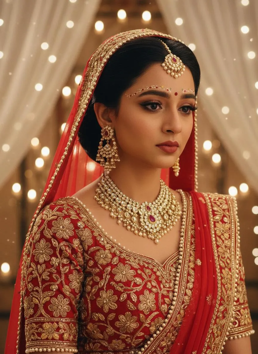 The identity of the uploaded portrait is strictly preserved (retaining facial contours, authentic Indian skin tone, hairstyle and age). This is a close-up and bust portrait with a 3:4 aspect ratio, featuring a stunning traditional Indian bride around 30 years old with a gentle yet faintly sorrowful expression. Her makeup is exquisitely rich and dramatic: smoldering smoky eyes paired with a matte vintage red lip, a large red crystal bindi adorned on her forehead, and delicate red, yellow and gold Gulab Patti floral appliqués dotted across her forehead and cheeks, with a fresh, flawless and well-blended base makeup. Her jet-black hair is sleek and long (or styled into a neat chignon), with a rose-red dupatta edged with gold threadwork wrapped around her head; the dupatta is embroidered with intricate golden interlocking floral patterns along the hem and drapes softly over her shoulders. She is dressed in a red heavily hand-embroidered Lehenga Choli: the blouse is fully embellished with golden interlocking floral motifs and trimmed with a delicate pearl border. She wears large multi-layered openwork gold earrings with tiny dangling diamond accents, a stack of gold necklaces inlaid with rubies around her neck, and an ornate maang tikka encrusted with pearls and rubies atop her head. The background is a warm-hued wedding ceremony setting: soft candlelight (candles/fairy lights) glimmers all around, creamy white sheer drapes hang in hazy folds, and the blurred backdrop enhances the atmospheric feel. Bollywood cinematic lighting is adopted: warm golden soft light is cast from the side, outlining her facial contours and the delicate texture of the Gulab Patti, accentuating the luster of the gold jewelry, and creating a dreamy, hazy sense of ritual. The style is a vintage Bollywood bridal portrait, with rich, saturated colors, exquisitely detailed textures, and an immersive emotional atmosphere that evokes profound sentiment.