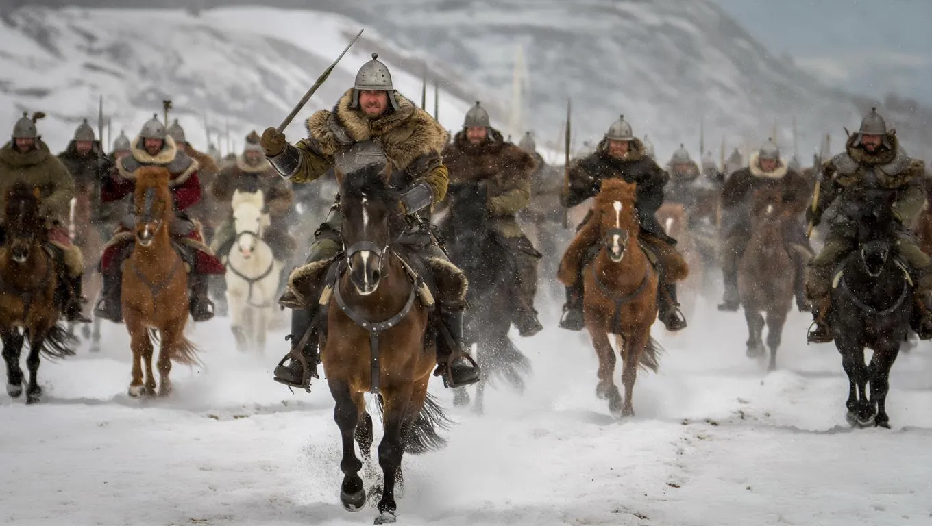 Generate stunning AI art of a Slavic warrior victory scene: fierce warriors chasing defeated Khazars as the battle ends. Vivid historical battle imagery crafted with AI tools for epic, professional-grade artwork. Create your dynamic moment at VivaGo.ai.