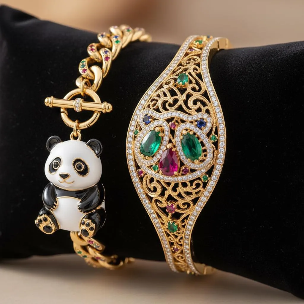 Design an elegant, luxurious bracelet collection inspired by your reference picture symbol. Craft distinct AI-generated designs using gold, emeralds, rubies, and sapphires. Achieve custom, visually connected luxury jewelry pieces effortlessly with Vivago.ai.