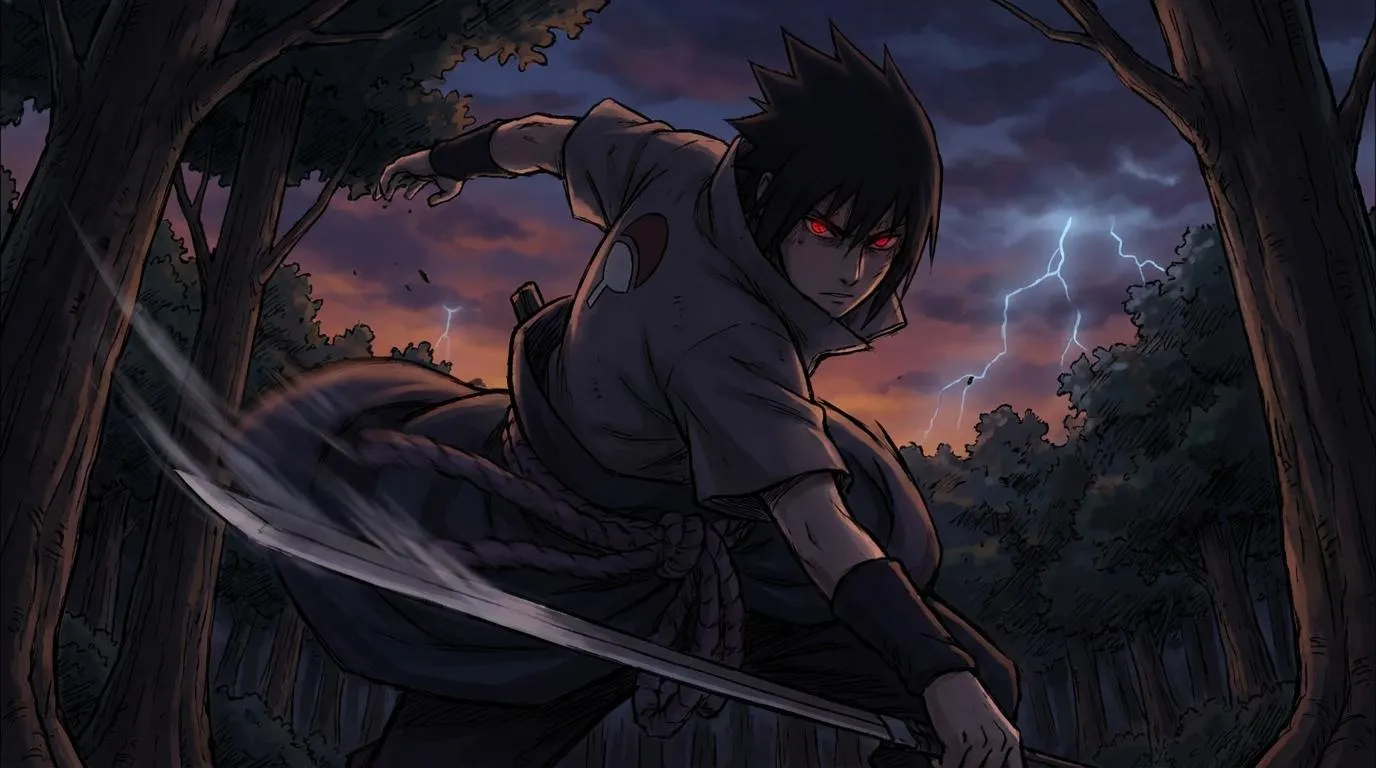"Anime-style illustration of Sasuke Uchiha standing in a dark forest at dusk. His black hair flows, Sharingan eyes glowing red, wearing his dark ninja outfit, holding a sword in a battle-ready stance. Subtle lightning effects in the background, dynamic pose, motion blur on cloak, dramatic shadows, cinematic lighting, highly detailed anime action scene, intense and moody atmosphere."