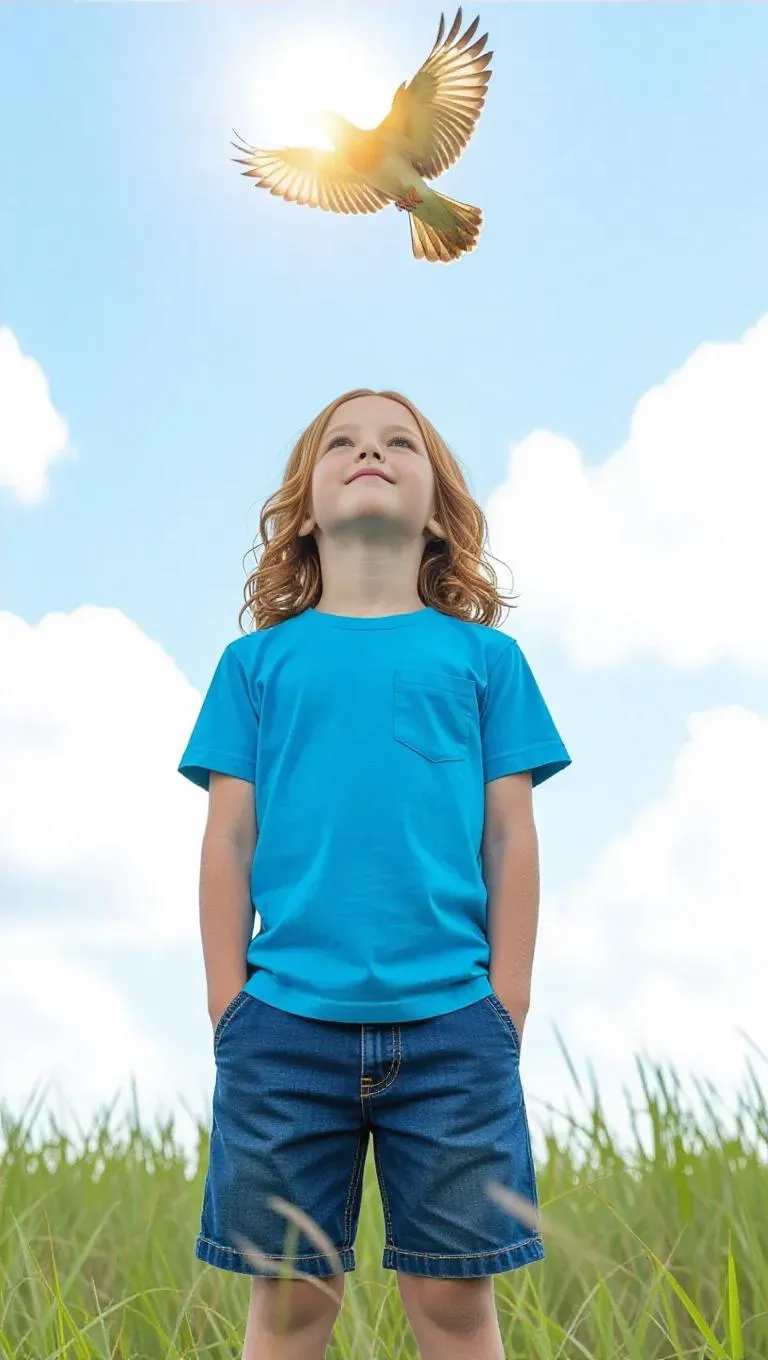 Generate an AI-powered image of a boy with jungle-green eyes, wavy red hair, and a blue outfit, witnessing a healed bird's flight. Capture magical realism with vivago.ai's creative tools—transform text into vivid visuals, glowing feathers, and lifelike scenes using advanced AI effects for professional storytelling.