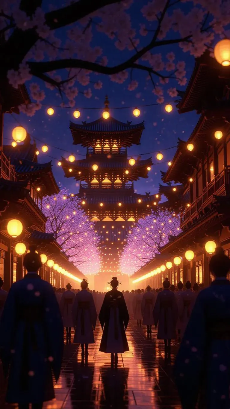 Experience a vibrant Chinese-style AI-generated anime scene of a lantern festival with ancient romance. Noble carriages, swirling dancers, and a poet's quest under glowing lanterns lead to an ethereal encounter with a golden-haired maiden. Soft particle effects, dreamy lighting, and traditional aesthetics blend in this animated depiction of Tang Dynasty splendor.