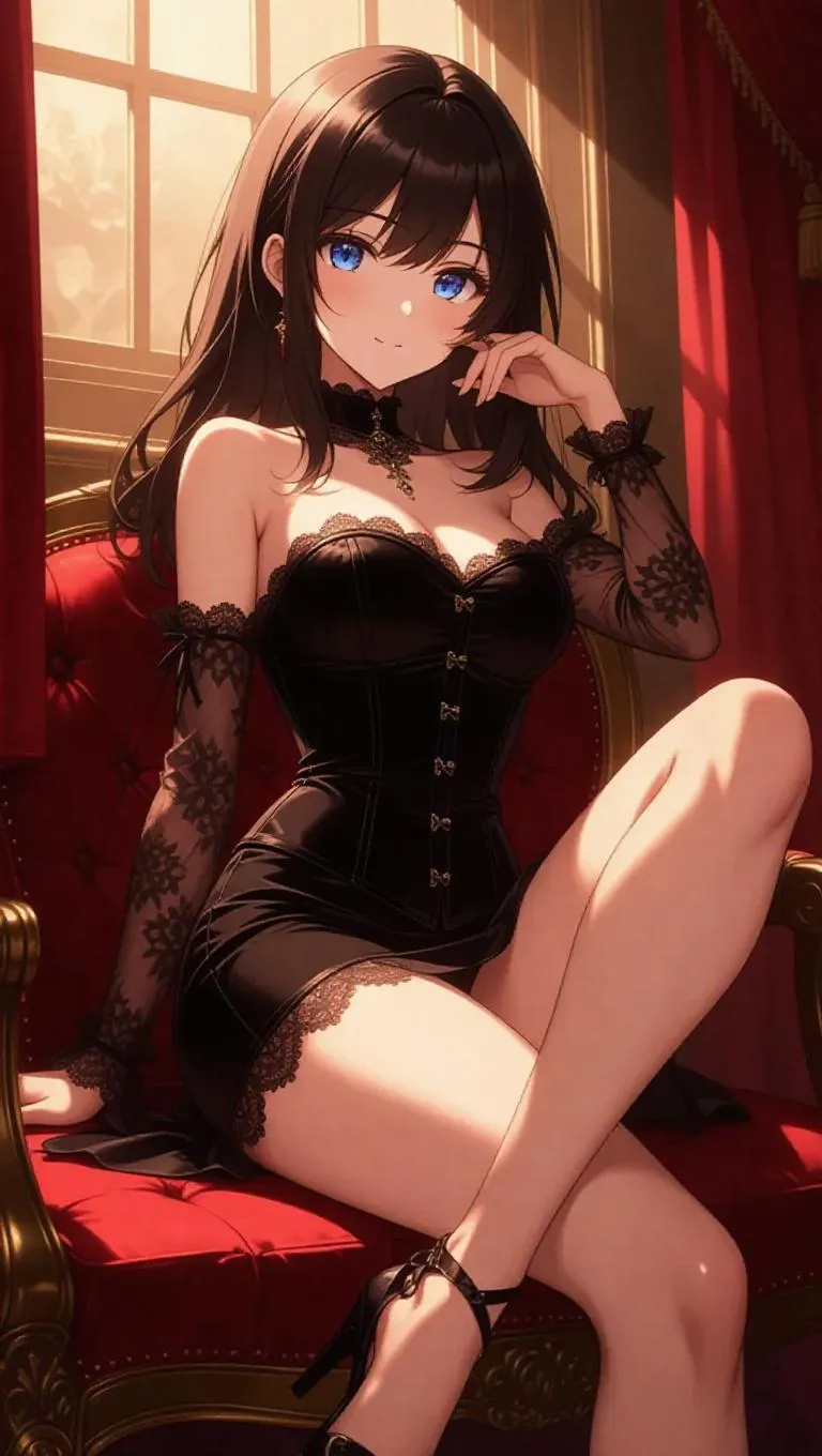 An anime model in a black velvet corset dress and lace sleeves lounges backstage at a glamorous fashion show. She crosses her legs nonchalantly, her chic flats catching the glint of studio spotlights. The backstage area is softly lit with warm shadows, creating an intimate atmosphere and highlighting her carefree, joyful demeanor. The style merges casual fashion and anime aesthetics, focusing on easy lines and inviting shadows.