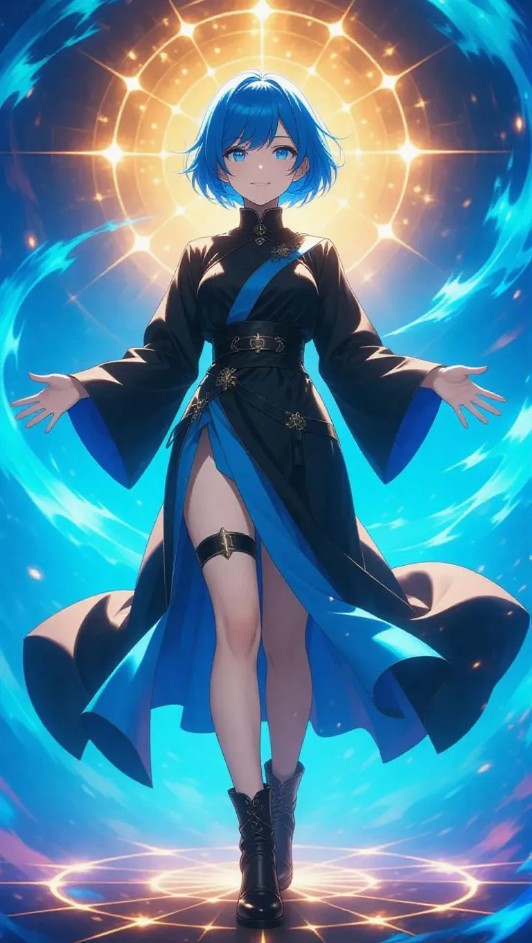 An anime sorceress with short, spiky blue hair stands in a summoning circle, her flowing robe and ankle boots accentuating her figure. She summons magic, with fiery circles encircling her, casting a bright, radiant light. The wind howls around her, adding an intense energy to the scene. The environment is bright and cheerful, with sunlight casting soft glows. The lighting is bright and vibrant, highlighting her joyful expression and the intricate details of the magic circles. Style: Anime, with a touch of whimsy and adventure.