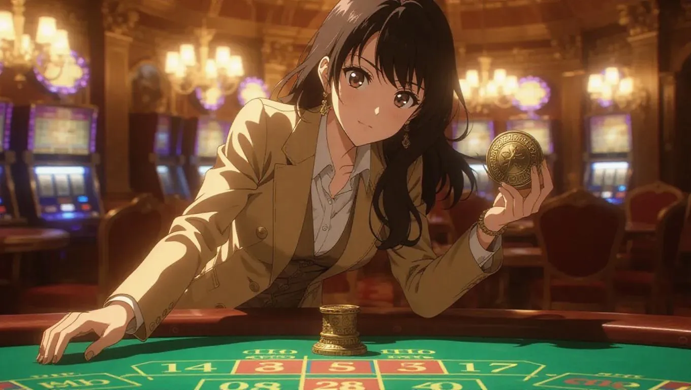 An adventurous anime archaeologist in a beige satin suit, stylish leggings, and rugged boots leans curiously on a treasure-themed casino table. She holds a relic in one hand, her expression excited and intrigued. Ancient artifacts fill the background, illuminated by soft, earthy ambient lighting. The scene brims with discovery and exploration, layered with adventurous spirit. Style: Anime, with a realistic touch.