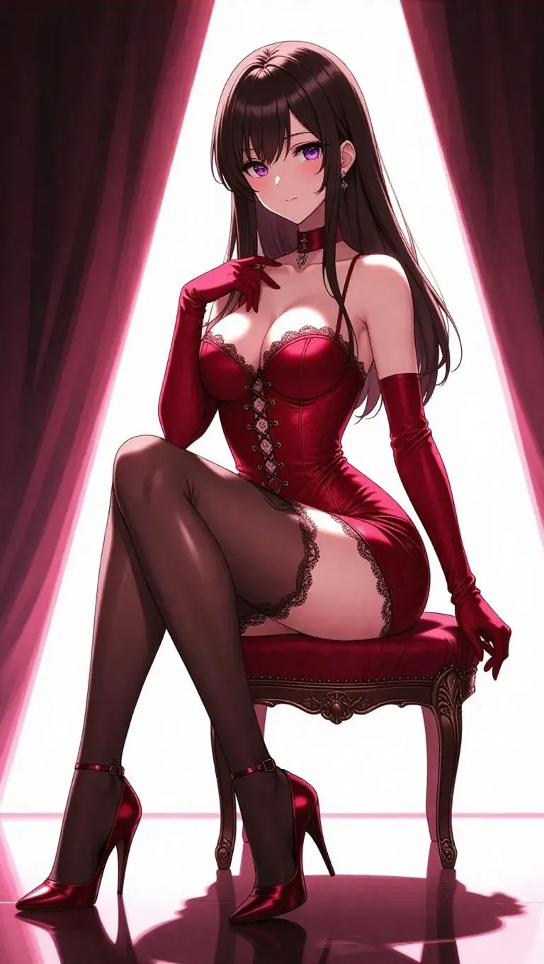 An anime model in a crimson lace corset dress and long satin gloves poses backstage at a glamorous fashion show. She crosses her legs elegantly, her stilettos catching the glint of studio spotlights. The backstage area is dimly lit, with the harsh, focused light creating sharp contrasts and highlighting her poised, confident expression. The style is a blend of high fashion and anime aesthetics, emphasizing sleek lines and dramatic shadows.