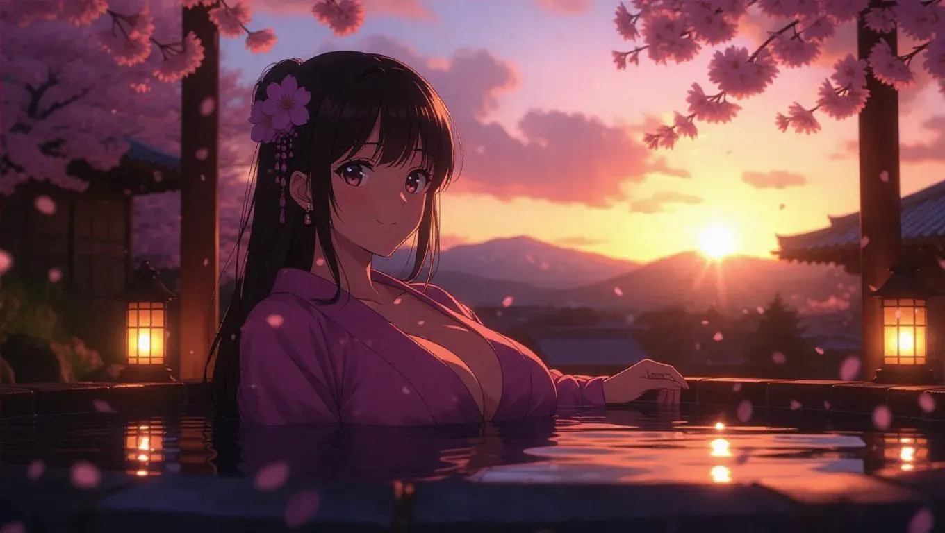 A luxury anime spa scene where a curvy woman in a silky robe happily lowers herself into a hot spring during a sunset, surrounded by cherry blossoms. Soft steam, ambient lantern light, and delicate reflections enhance the moody ambiance.