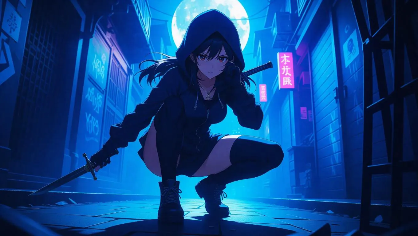 A playful anime thief in dark, stealthy attire, mid-sneak with a dagger in hand. She crouches in a moonlit city alley adorned with graffiti, the air filled with a sense of excitement. Cool, blue light from the moon casts sharp shadows, highlighting the thief's agile movements and the creativity of the urban art. The scene is infused with a sense of cunning and adventure, capturing the essence of a thrilling escapade.