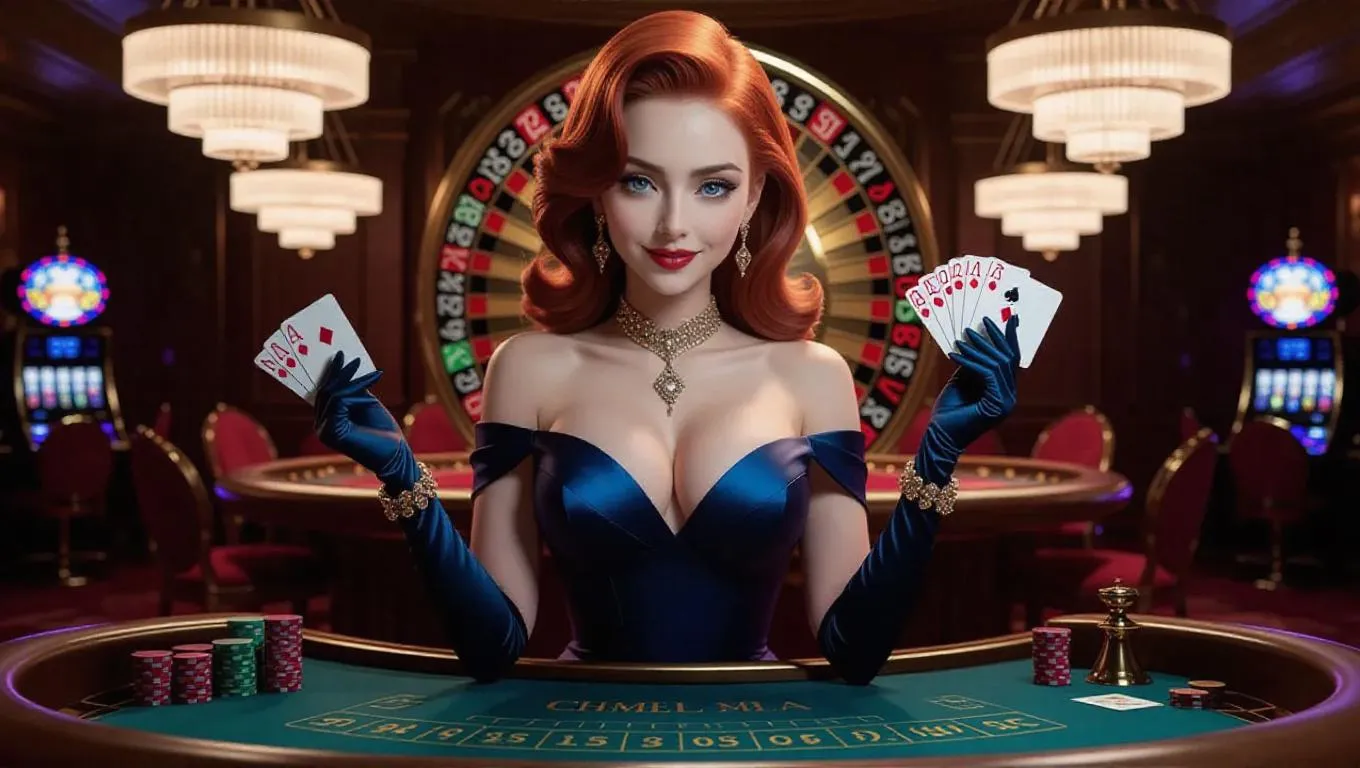 1 enchanting and alluring woman, solo, (incredible high resolution, masterpiece, highest quality, highly detailed, CG, high quality anime illustration), (female host presenting cards), (chic evening gown, off-shoulder design, fancy gloves), (redhead, sleek hair, sapphire blue eyes, jitome: 1.2, dreamy eyelids, luscious lips, well-defined curves, stunning and intricate face), (playful smirk, teasing and flirtatious expression, charming pose like a high-end escort), (magnificent detailed background, radiant ambiance, background: luxurious casino, roulette wheel, fine champagne, indulgent atmosphere, pink glow, perspective from the left)