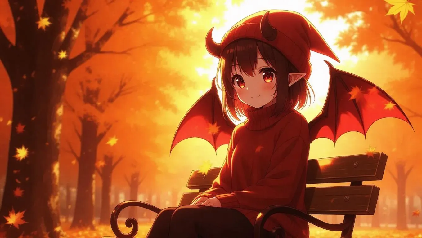 A cute anime demon girl with glowing red horns and shimmering wings sits on a park bench during autumn. She wears a cozy sweater that enhances her charm, and a playful hat that complements her appearance. Her eyes twinkle with kindness as she watches the falling leaves. Flames swirl in the sky above her, casting soft shadows and highlights. The scene is filled with warm oranges and yellows, creating a cozy and inviting atmosphere. The style is a blend of slice-of-life and anime aesthetics, highlighting the warmth and friendliness of the image.