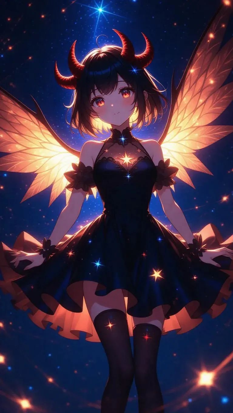 A whimsical anime demon girl with glowing red horns and shimmering wings floats in a starry night sky. She wears a celestial-themed outfit adorned with stars and moons. Her eyes sparkle with wonder as she gazes at the constellations. Flames dance through the cosmos behind her, casting celestial shadows and highlights. The scene is bathed in deep blues and luminous whites, creating an ethereal and dreamlike atmosphere. The style is a mix of fantasy and anime aesthetics, enhancing the magical and captivating essence of the image.