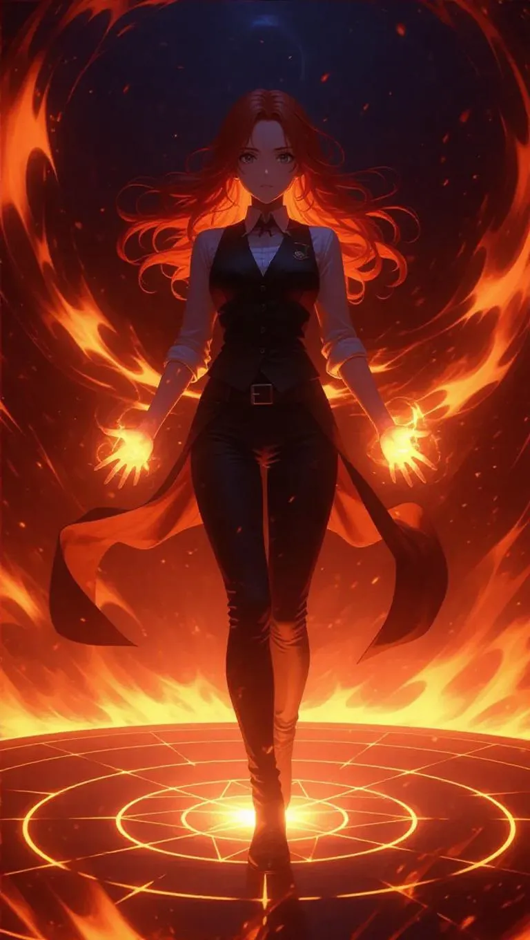 An anime sorceress with flowing orange hair stands in a summoning circle, her fitted vest and skinny jeans accentuating her figure. She summons magic, with flickering flames encircling her, casting a fiery light. The wind howls around her, adding a chaotic energy to the scene. The environment is intense and heroic, with a horizon on fire in the background. The lighting is intense and warm, highlighting her determined expression and the intricate details of the magic circles. Style: Anime, with a touch of heroism.