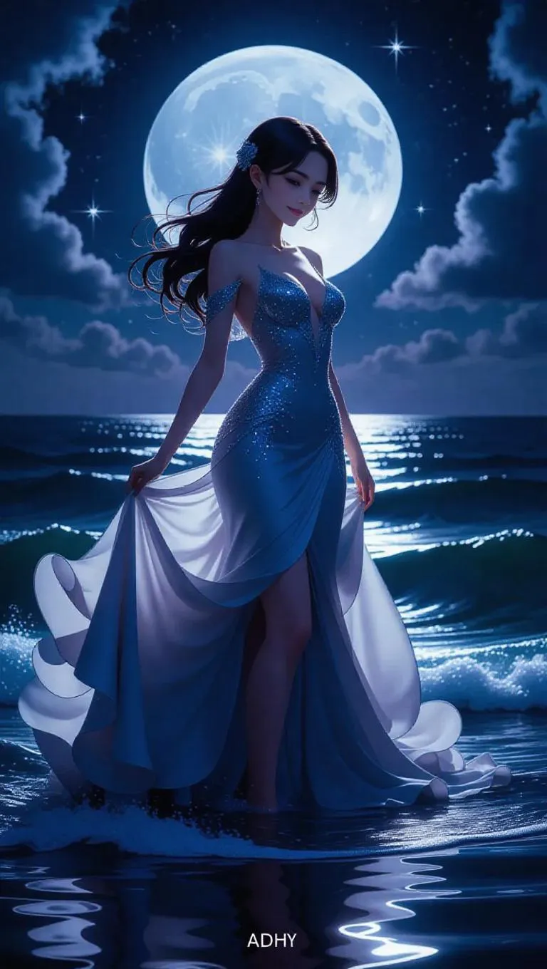 A graceful woman in an elegant evening gown steps into a moonlit sea, surrounded by twinkling stars. Her shimmering hair falls gently over her shoulders, and her dreamy smile conveys a sense of peace. Gentle waves lap at her feet, mingling with the enchanting glow of the moonlight. Subtle reflections gleam on the water's surface, enhancing the magical and romantic atmosphere. The scene is softened with cool, silvery tones, creating an ethereal and dreamlike ambiance. Style: Anime.