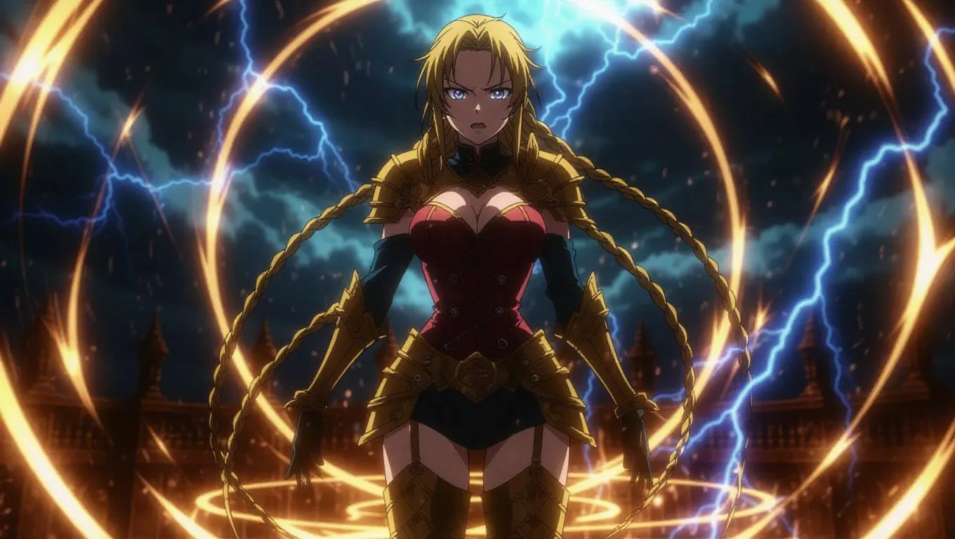 An anime sorceress with long, braided blonde hair stands in a summoning circle, her armored corset and combat boots accentuating her figure. She summons magic, with crackling lightning encircling her, casting a sharp and electric light. The wind whips around her, adding a fierce energy to the scene. The environment is stormy and wild, with flashes of lightning illuminating the darkness. The lighting is stark and dramatic, highlighting her fierce expression and the intricate details of the magic circles. Style: Anime, with a touch of intensity and power.