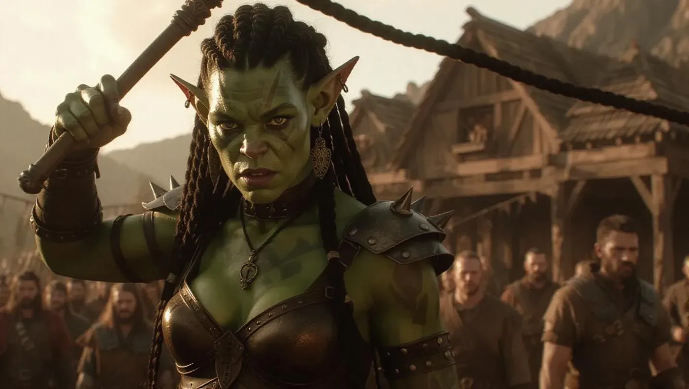 Generate AI fantasy art with a powerful green Orc warrior wielding a whip in an ancient quarry, commanding enslaved humans hauling stones. Use Vivago.ai's AI image tools to create detailed dark fantasy scenes, dynamic character designs, and atmospheric environments through text-to-image prompts and professional editing effects.