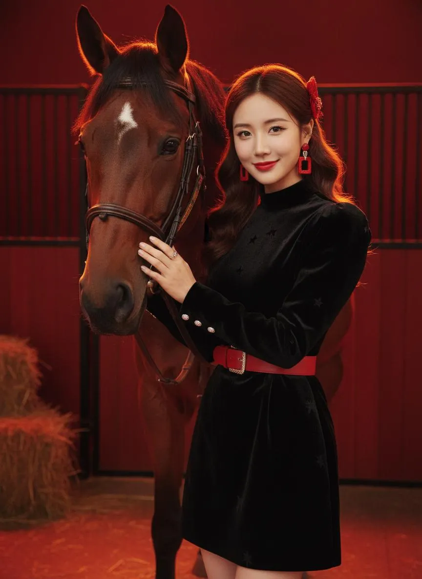 Medium close-up shot: The image in the uploaded picture (with facial features, gender and age unchanged) has its hair coiled (with a small red bow accessory), located on the right side of the frame, while a close-up of the side head of a brown horse is on the left side of the frame. This work presents a sweet and dreamy theme characteristic of the Chinese Year of the Horse. The picture has a delicate film texture; Tone: Professional indoor lighting is used, with high-contrast warm light illuminating the face of the person and the horse, the highlighted hair light (contour light) forming a golden halo at the edge of the hair, the tone is clean and bright, the horse contrasts strongly with the richly saturated dark red background, the contrast between light and shadow is intense, creating a dreamy and warm atmosphere, with a fashionable and avant-garde photography art atmosphere; Color: The main color is a low-saturation clean dark red background, the horse, red leather (horses' reins, stars on the skirt), low-saturation, high-quality and warm harmonious color; Composition: Balanced medium close-up composition. The brown horse (one side of the head) occupies the left half of the frame (about 45% - 50%), the person (upper body + head) occupies the right half of the frame (about 40% - 45%), the person and the horse are closely embraced, forming the visual center; Shooting angle: Horizontal perspective, the camera is at the same level as the person's face in the uploaded picture and the side head of the horse, creating a natural and friendly interaction feeling; Person's posture: The body tilts slightly towards the camera, the upper body leans lightly against the brown horse, the head is close to the horse's face, with a sweet and brilliant smile, looking straight at the camera, the arms are naturally placed in front of the body, the posture is relaxed and intimate; Clothing: Wearing a black velvet stand-up collar and puff sleeve mini dress, with a wide red belt and exquisite metal cuff buttons, paired with retro red geometric-shaped earrings and bright red lip makeup, wearing exquisite high-end custom accessories, fashionable and avant-garde, delicate and elegant; Image content ratio: Horse (45% - 50%), person (40% - 45%), the retro scene background of the outdoor haystack and stable (about 10%). Image content ratio: Horse (45% - 50%), person (40% - 45%), the authenticity, artistry of the film, film-level ultra-high-definition 8K image quality, fashion magazine style, photography pioneer fashion art style, top-notch lighting effects.