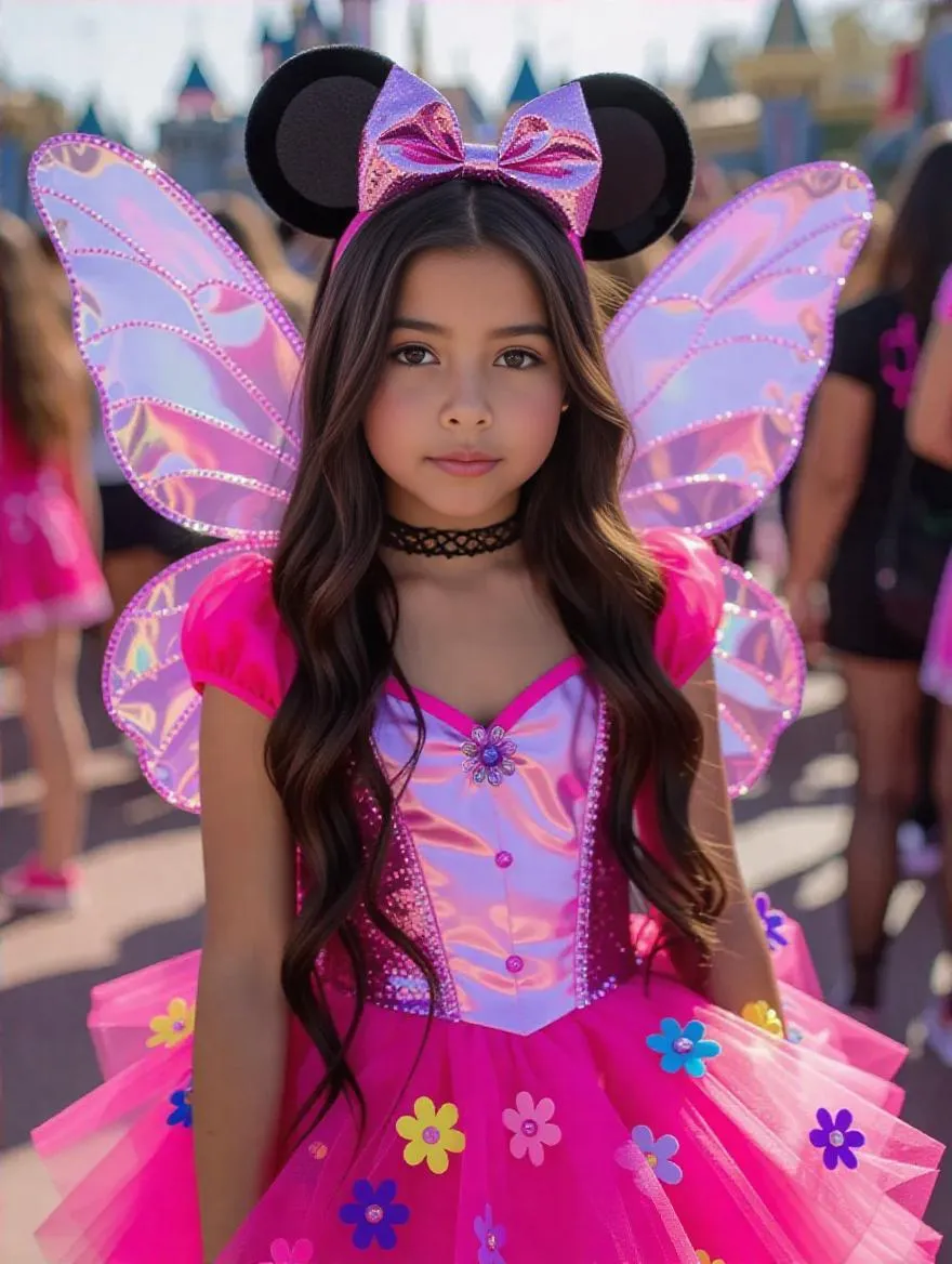 An embarrassed nervous uncomfortable pouty tween latino boy looking like a latina girl wearing a beautiful hot pink minnie mouse princess dress mixed with bright colors and little flowers on the skirt, glitter and sparkles, iridescent fairy wings with a soft shimmer that shifts from pink to lavender in the light, sheer black pantyhose, minnie mouse ears, long brunette wig, pink lipstick, makeup, hot pink nails, black eyeliner, mascara, long pretty lashes, pretty eyes, pretty lips, adorable, earrings, choker, pink slippers, flushed face, Mother-Daughter day at Disneyland, park full of girls, looks like a pretty little girl!