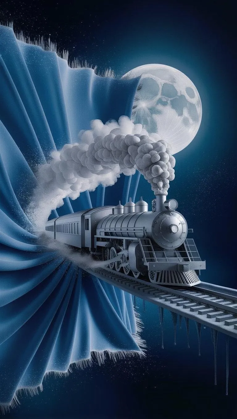 A moonlit train, forged from liquid silver and pale watercolor, bursts through the edge of a floating canvas suspended in twilight. The canvas ripples like velvet, half-real, half-painted, its surface bleeding soft blues and spectral white. As the train emerges, it leaves shimmering pigment trails in the air, blurring the boundary between dream and creation. Around it, a vast indigo void glows with drifting paint flecks like frozen stars. A surreal fusion of watercolor fluidity and 3D precision — hauntingly beautiful, ethereal, and bold in visual poetry.
