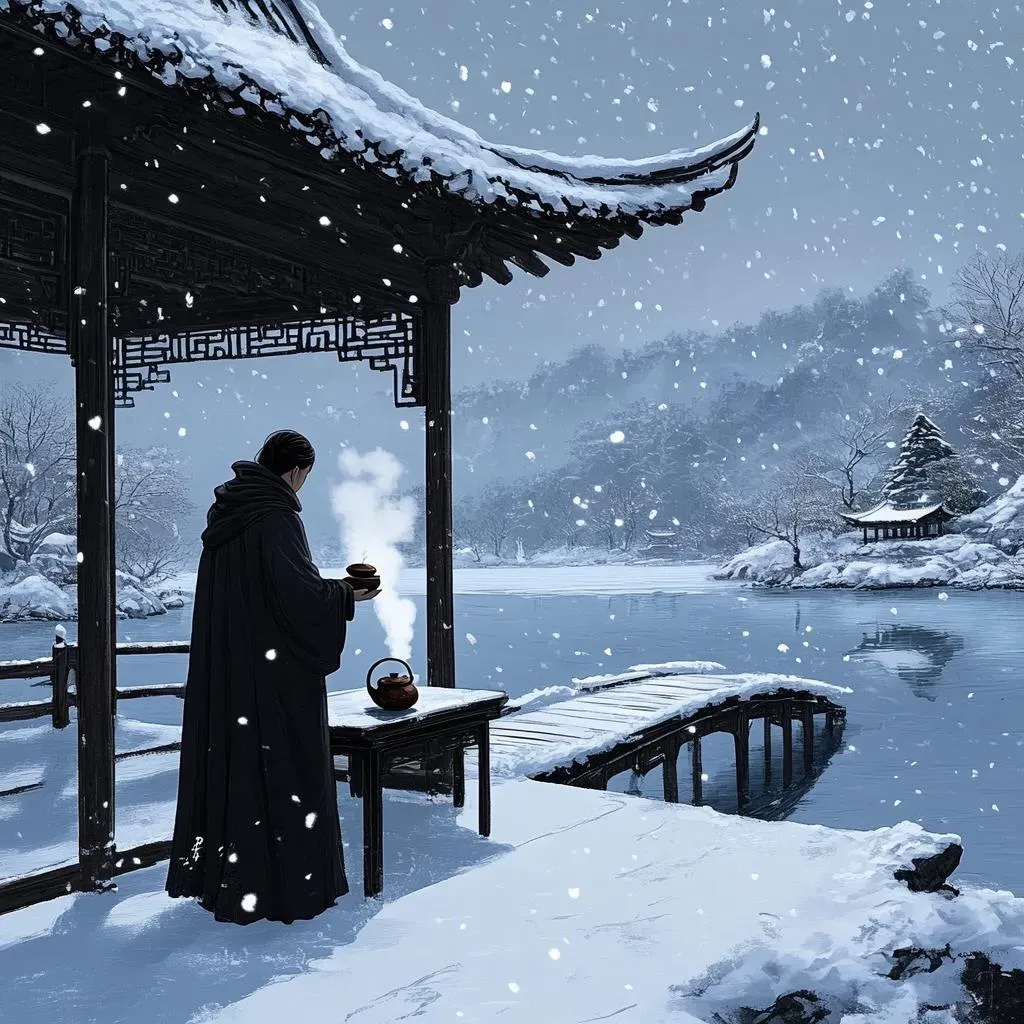 Capture the poetic serenity of a Chinese scholar in a snowy pavilion with AI-generated visuals. Inspired by Zhang Dai’s ink-painting aesthetics, this scene blends tranquil winter landscapes—steaming tea, drifting snowflakes, frozen lakes—into a solemn, animated masterpiece. Perfect for evoking traditional artistry and meditative calm through AI-powered Chinese-style imagery.
