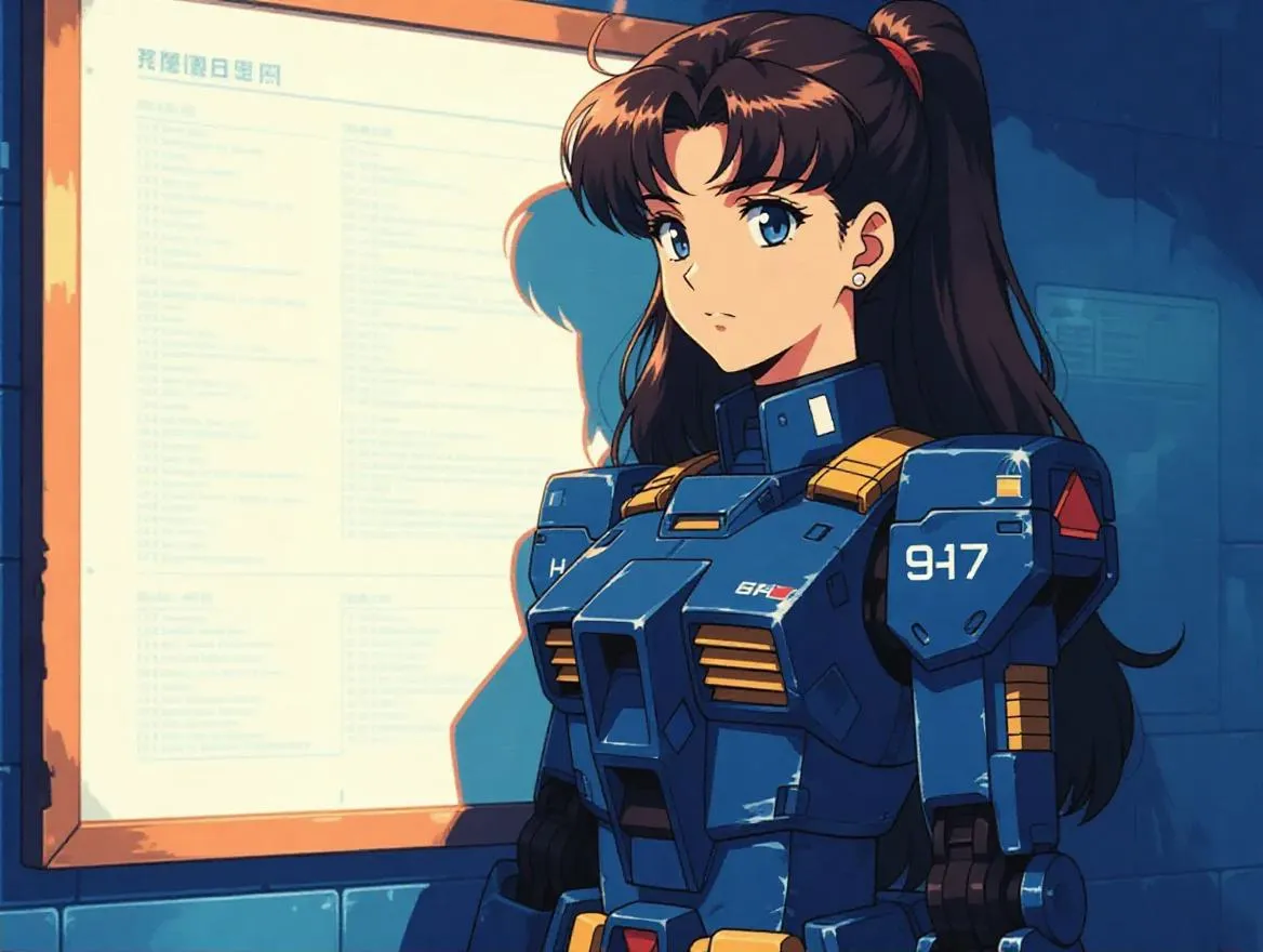 Text to Imagevintage anime art of lady in gundam uniform standing next to briefing board with numbers and text, military briefing, pc-98, pixel art, gradient, light and shadow, blueprintsRecreate