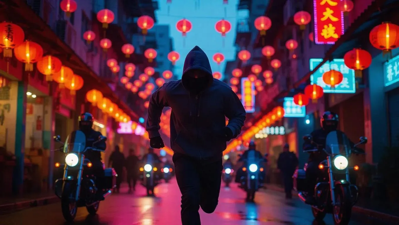 A fugitive in a well-worn hoodie runs through a colorful Chinatown market, neon signs shimmering in various hues behind him, as police arrive on motorcycles. Lanterns hang low, glowing brightly. Aerial drone view with rich cinematic depth and environmental storytelling.