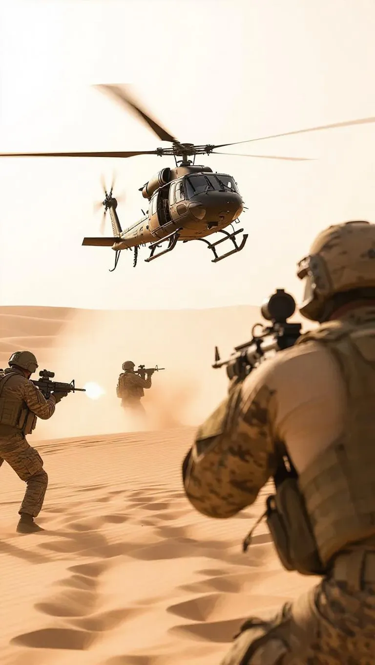 Text to ImageA stolen helicopter lifts off from a desert outpost, rotors whipping up sand, military operatives taking aim from dunes, shots narrowly missing, dramatic arid landscape, warm sandy tone, tension-filled atmosphere, desert chaos.Recreate