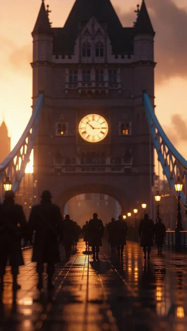 A clandestine meeting unfolds on a tower bridge bathed in twilight, where dressed-down negotiators flanked by armed guards exchange memos. Below, the city breathes in rainy rhythms, and a sniper scope glints in the dark. Long-lens compression with cinematic bokeh, stylized atmospheric haze.