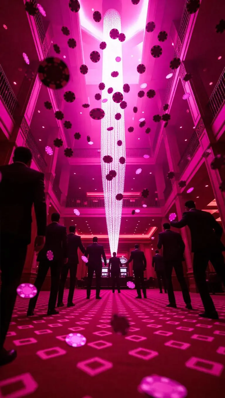 A dramatic casino heist in progress, mysterious figures entering through the ceiling in a grand atrium, glittering chips and money caught midair in slow motion. Giant geometric sculptures and patterned carpets contrast the chaos. Dynamic overhead camera view, freeze-frame intensity with soft pink lighting.
