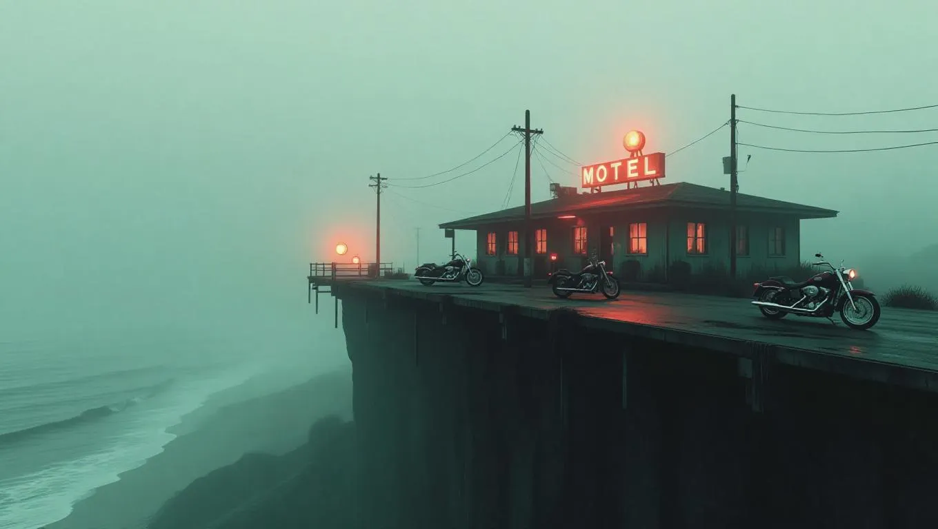 A spooky motel on a cliffside glows under glowing orbs, as a drug deal goes wrong, gunfire erupting between vintage motorcycles and shattered mirrors. A fog bank begins to creep in from the horizon, swallowing the atmosphere. Ethereal color palette with misty lens and ethereal shadows.