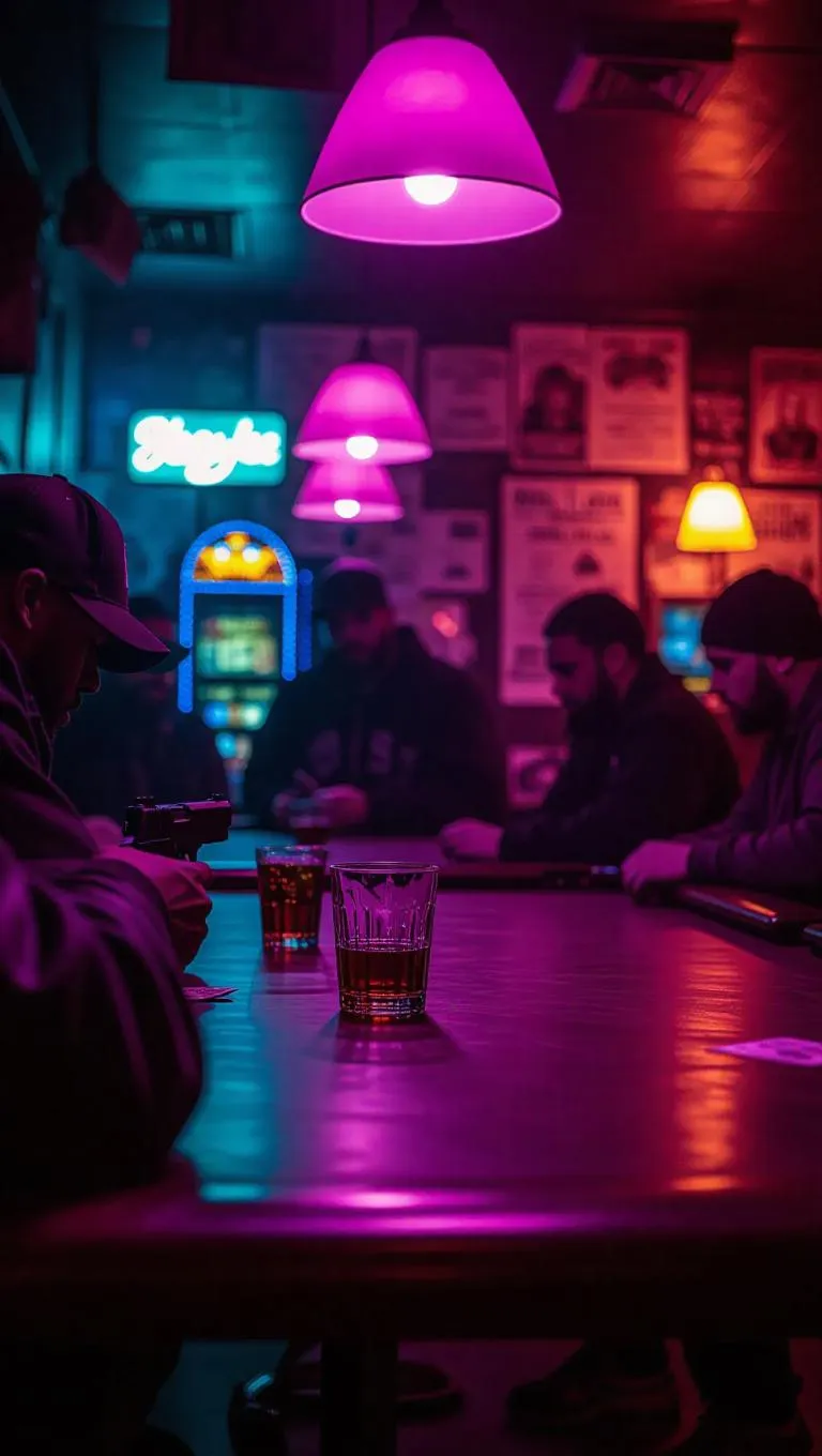 Inside a smoky pool hall, under flickering lavender lamps, gang members crowd around a leather-covered table, weapons resting beside shots of whiskey. The walls sweat with age, paper flyers peeling back dark tales. A jukebox flickers in the corner, stuck between static and an electronic track. Isolated character lighting with strong foreground blur and atmospheric texture.