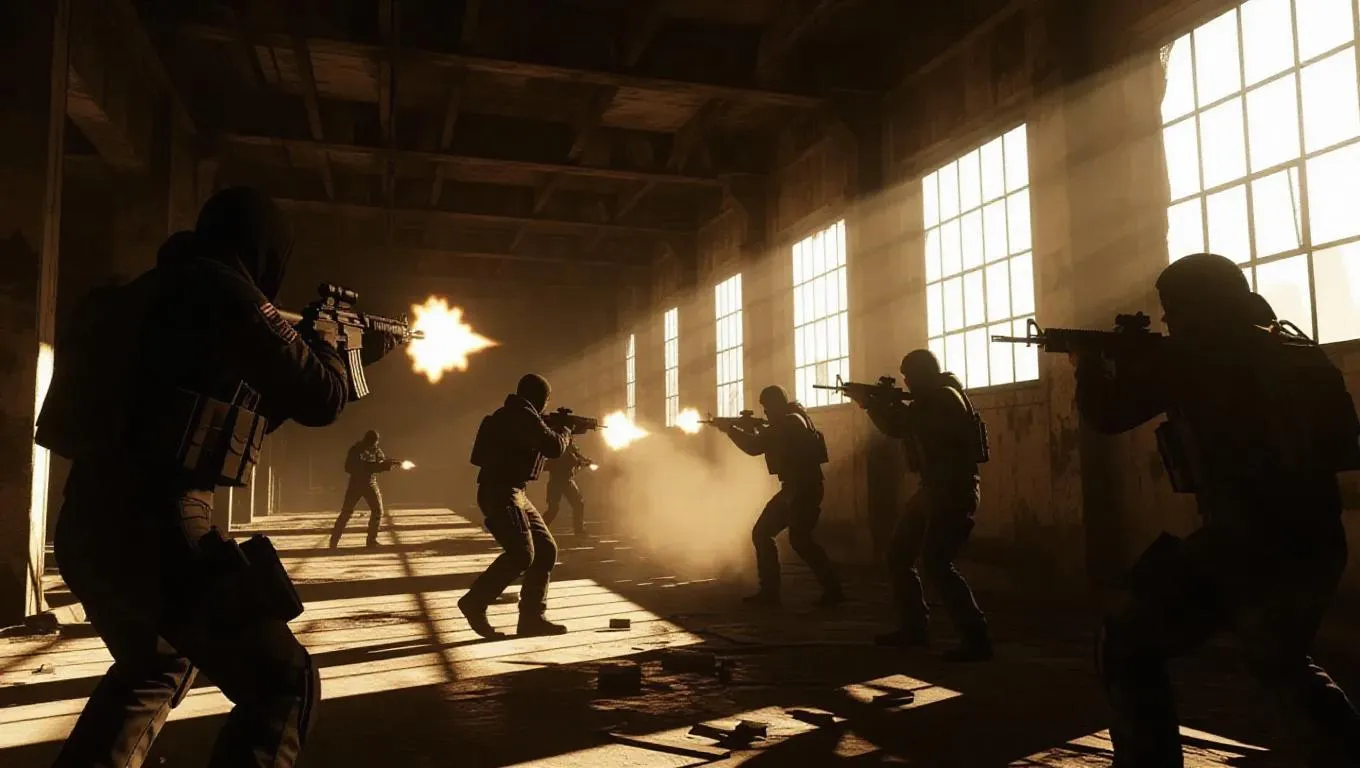 A gang ambushes a rival crew in an abandoned factory, their weapons glinting in the flickering light, echoes reverberating off the crumbling concrete. A sudden crash can be heard in the distance, adding to the tension. The scene is captured with a gritty, urban aesthetic, emphasizing the raw energy and danger.