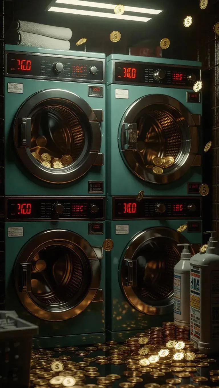 An illicit money laundering environment within a retro laundry, where dryer doors spin with gold coins instead of clothes. Gangsters gather cash around washing detergent and classic video games. Surreal realism with muted color tones.