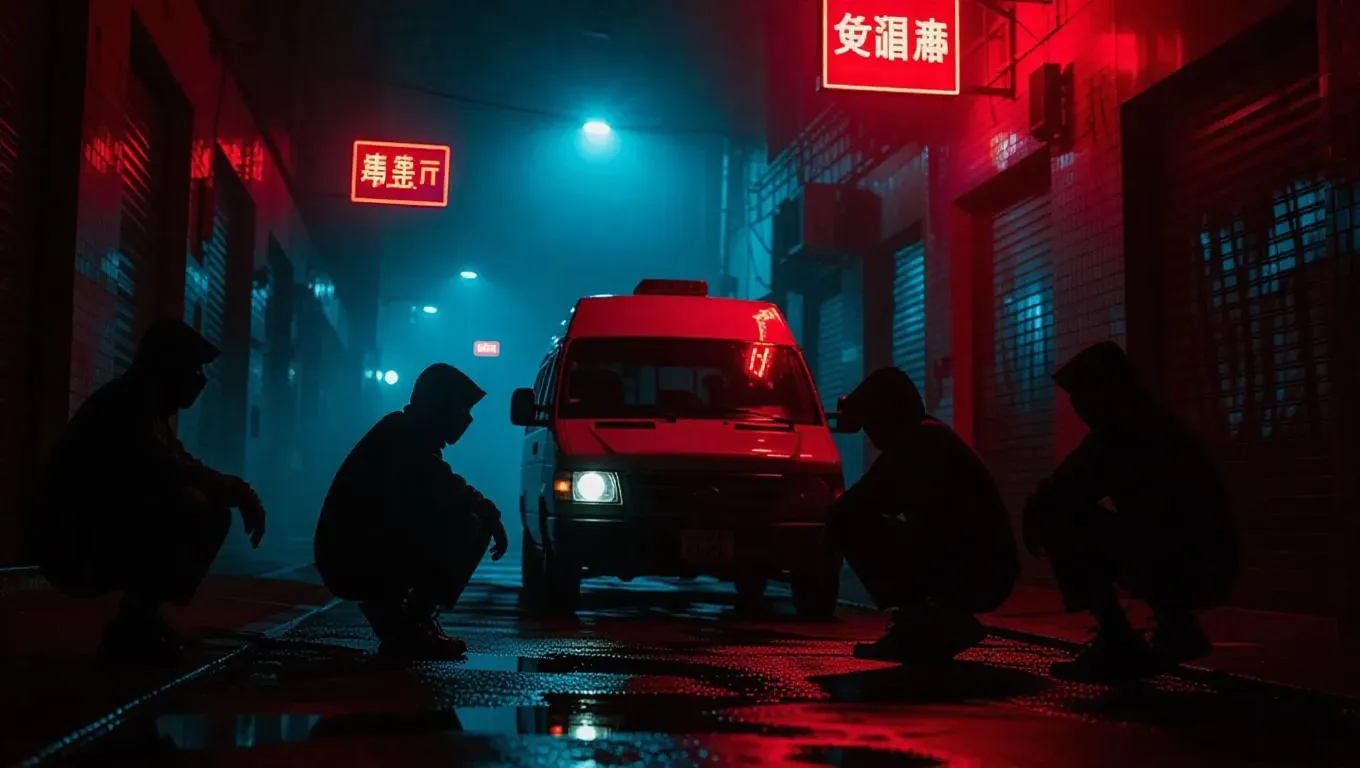 In a dimly lit alleyway, a crew of masked thieves huddle around a rusted armored van, its engine still warm. Neon signs flicker above, casting a mix of red and blue hues over their weary faces. A police chopper circles in the distance, its spotlight piercing the fog. Strong vertical lines and a monochrome palette emphasize the gritty urban setting.