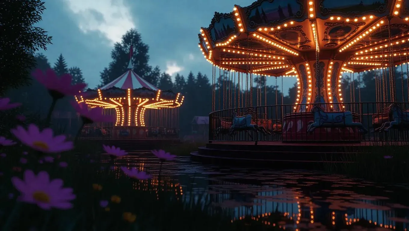 Text to ImageA derelict amusement park overtaken by rebels, with dilapidated rides turned into tactical zones. A carousel spins slowly with shimmering lights, abandoned and enchanting. Surreal post-apocalypse vibe with wildflower overgrowth.Recreate