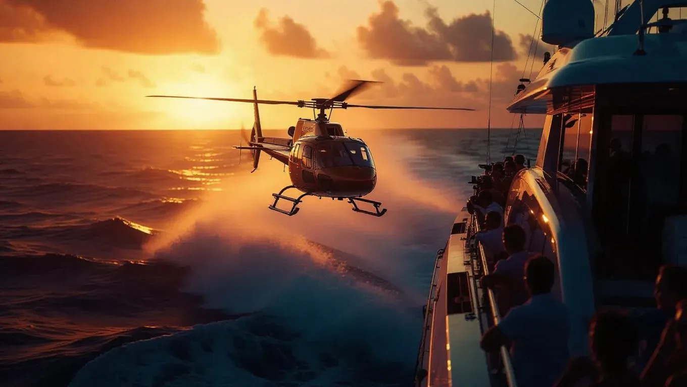 A stolen helicopter lifts off from a luxury yacht, rotors whipping up waves, guests taking aim from decks, shots narrowly missing, dramatic maritime setting, soft sunset tone, tension-filled atmosphere, nautical chaos.