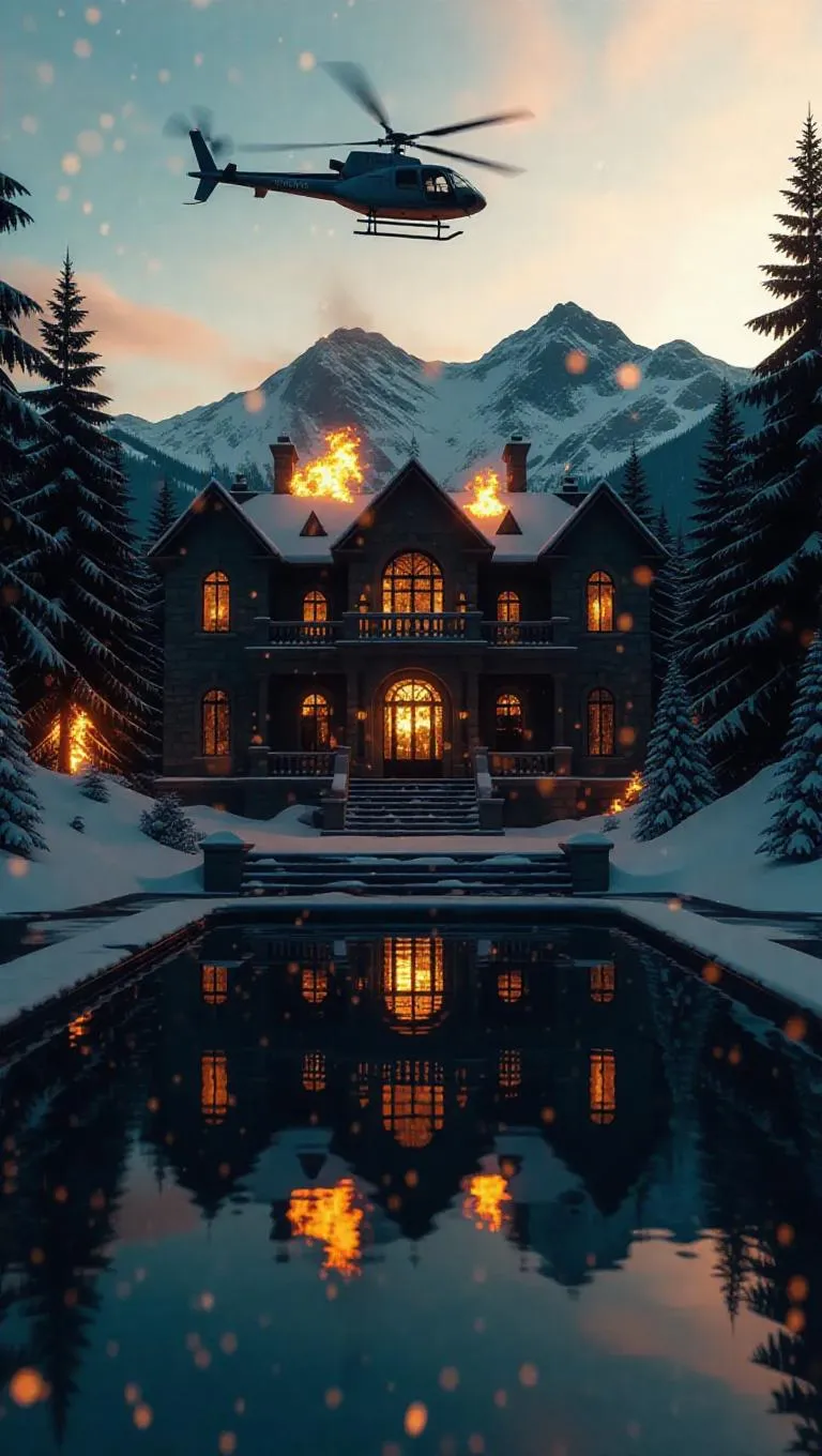 A booby-trapped mansion explodes in the snowy mountains, fireballs silhouetting evergreens, as a helicopter escapes into the twilight sky. Infinity pool reflects both fire and falling snowflakes. Epic wide shot with deep layering and orange-teal blockbuster palette.