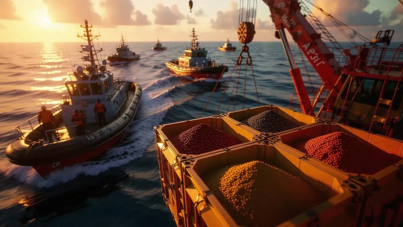 A crew of burglars utilizes a crane to elevate a shipping box full of exotic spices. Coast guard boats approach, their sirens ringing out. The scene is vibrant under the warm glow of sunset.
