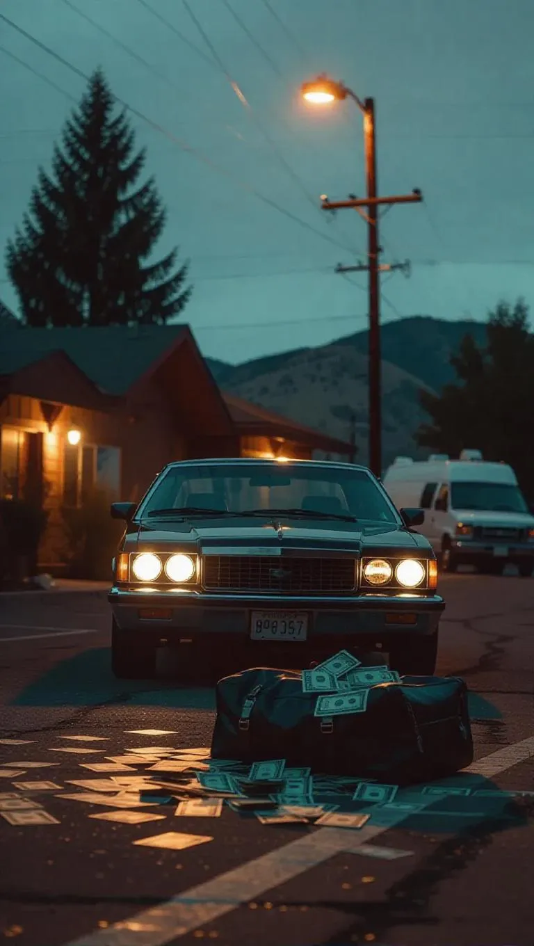 A tense exchange unfolds in a rustic motel parking lot, duffel bags of cash and drugs spread on the hood of a sporty coupe. Headlights abruptly flood the scene as a familiar van skids to a halt, capturing the chaos with dramatic motion and a tense, heated atmosphere.
