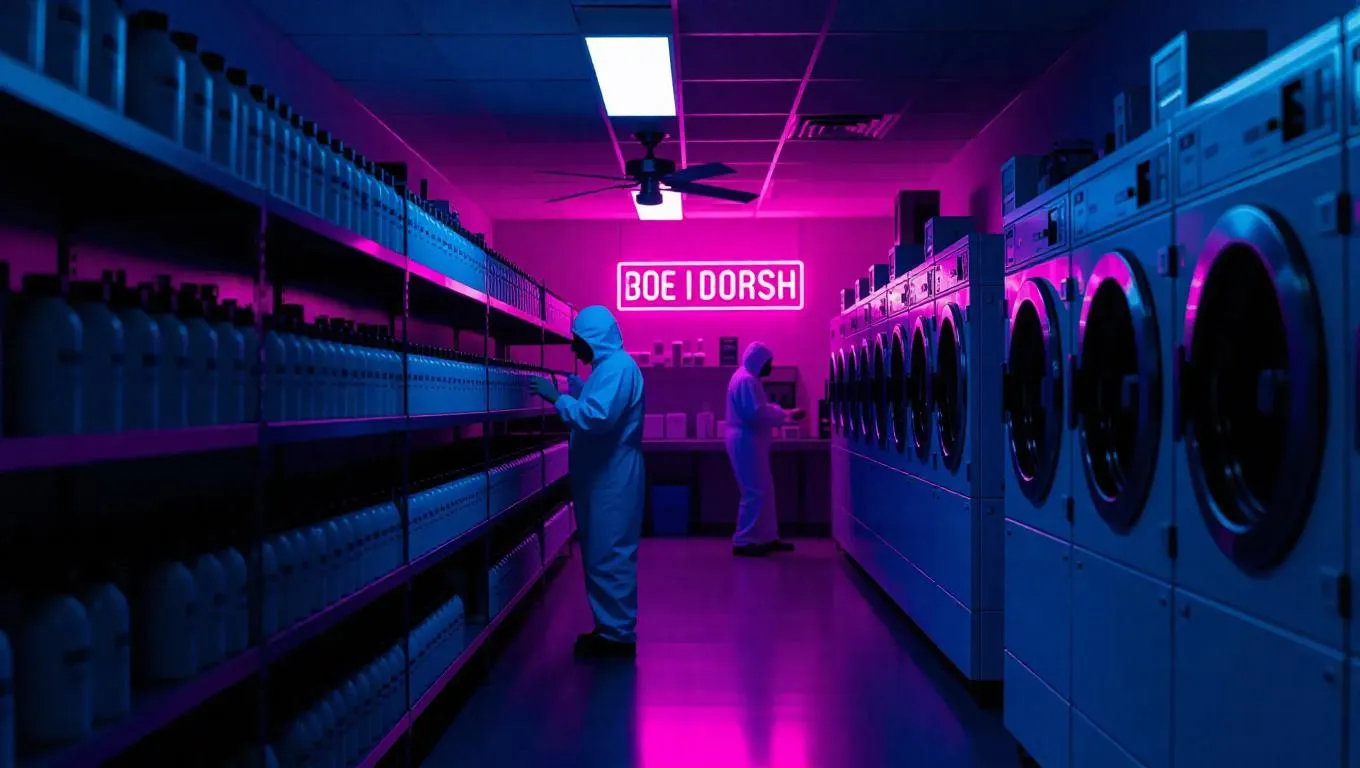 A drug lab hidden beneath a laundromat glows with ultraviolet light, shelves stacked with equipment, as figures in coveralls race to destroy evidence before a raid. Ceiling fans cast eerie rotating shadows across a flashing LED display. Tense neon-dystopia interior with textured walls.