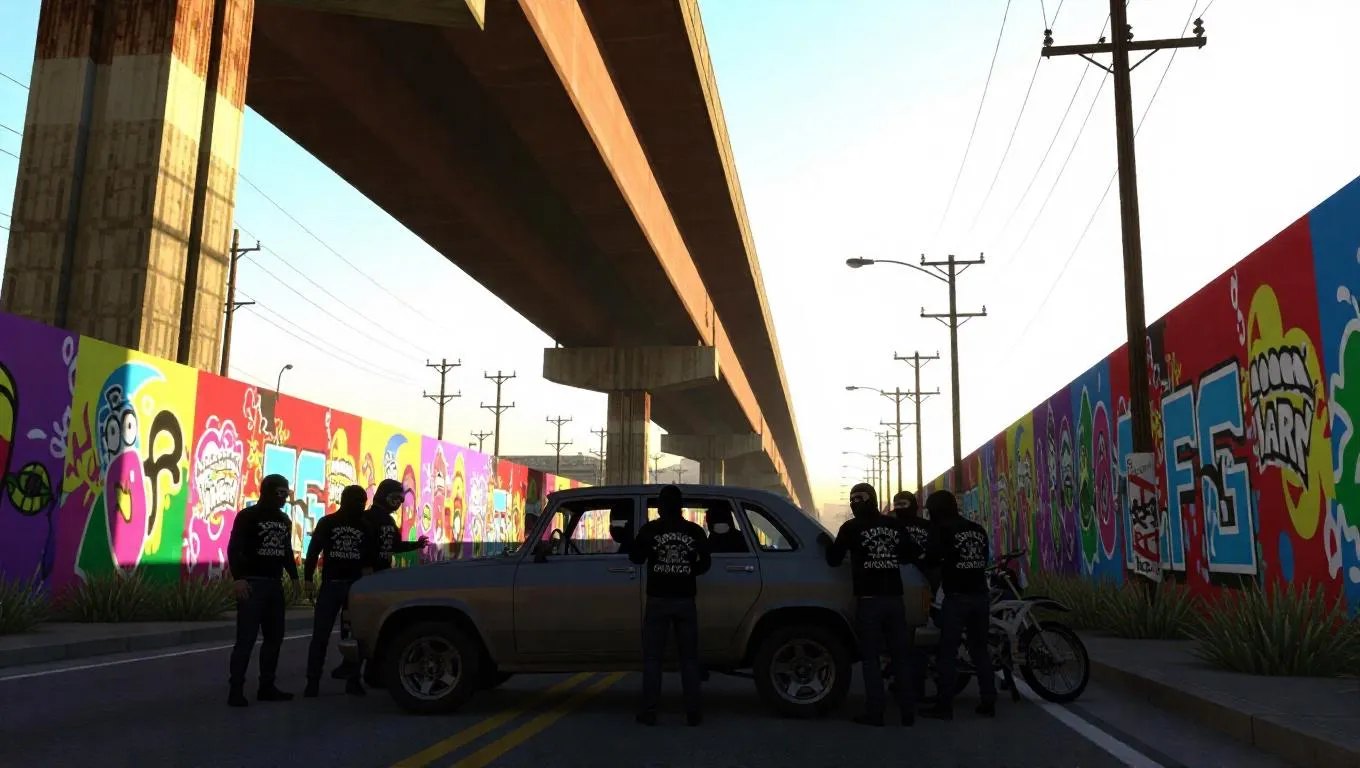 Text to ImageA group of masked bikers huddles around a stalled armored car beneath a rusty overpass, bright floodlights casting fierce contrasts, colorful murals behind them relaying messages of uprising.Recreate