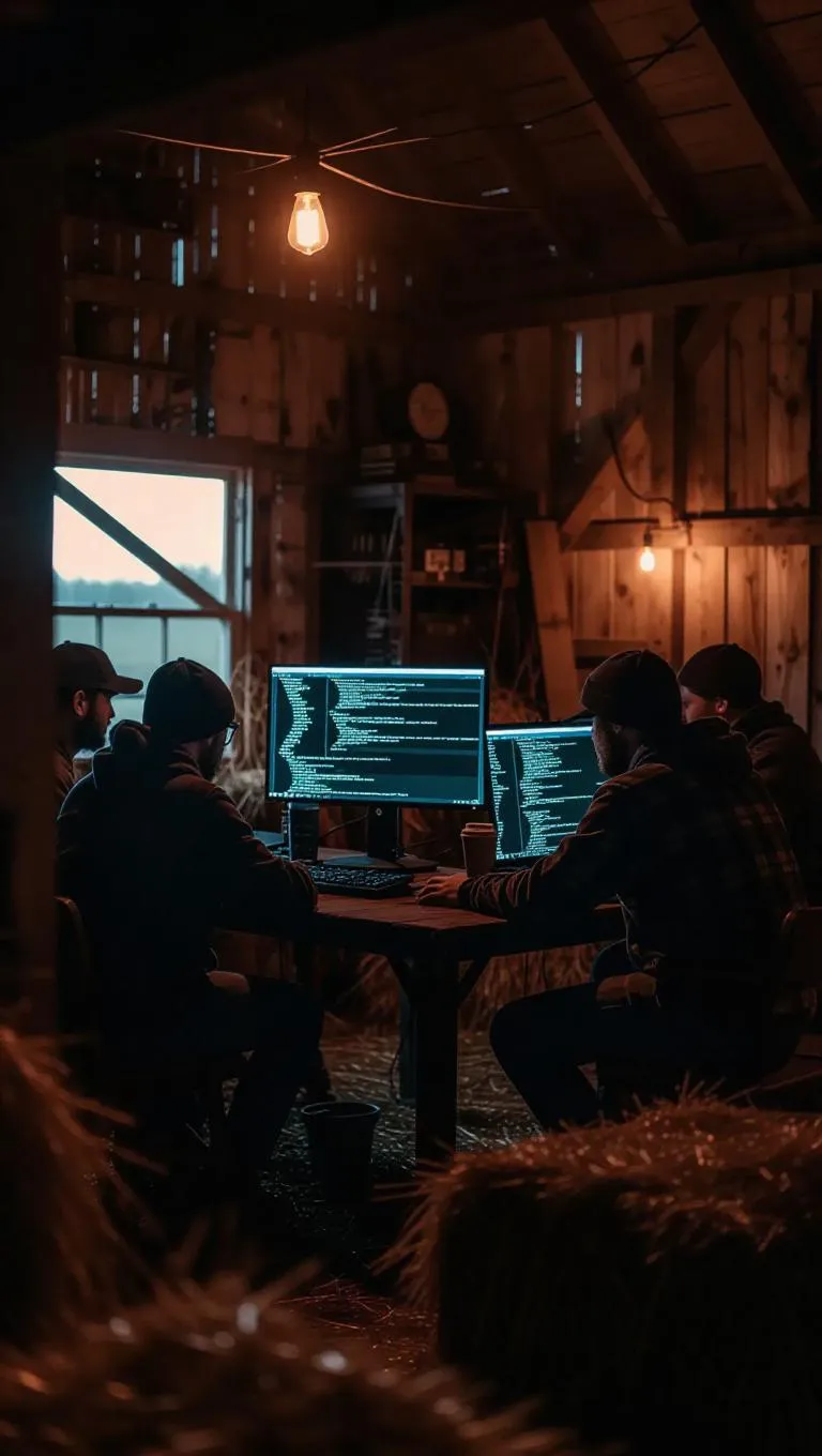 A group of hackers in a rustic barn surrounded by hay and farm equipment, uploading a virus as twilight reflects code across their faces. Rural cyber-thriller vibe with warm twilight and nostalgic focus.