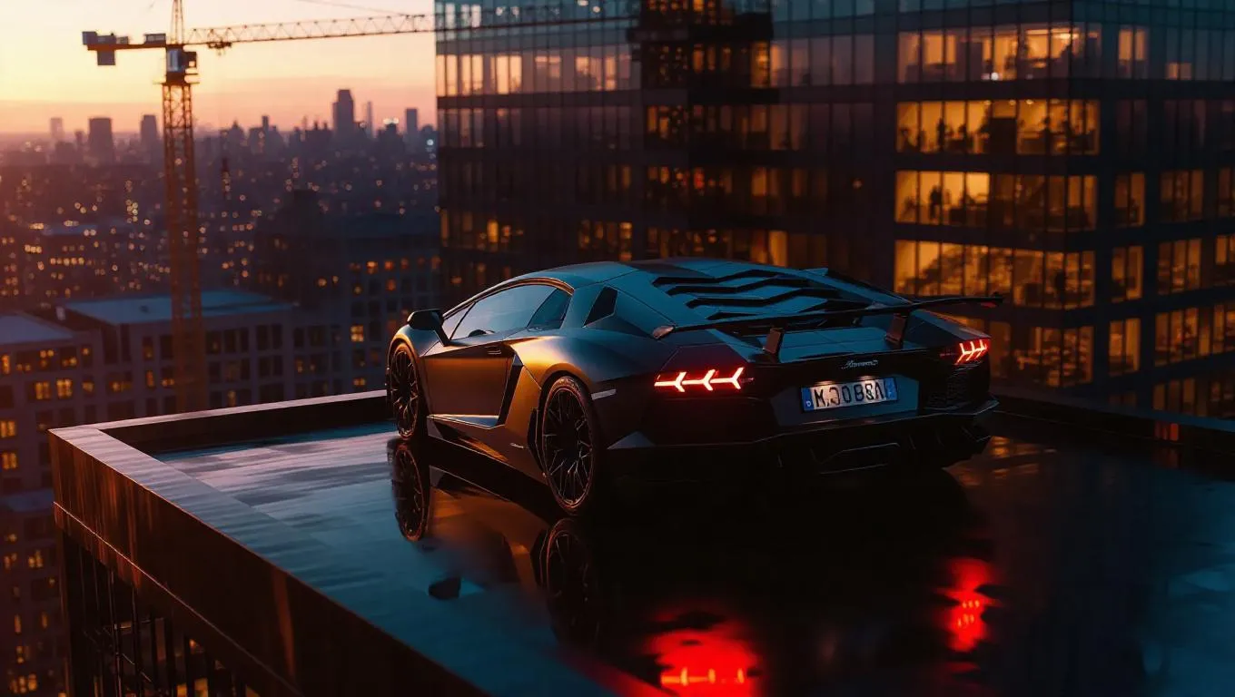 A stolen supercar crashes through a barrier, ascends to a rooftop landing, its undercarriage reflecting city lights. Amber and charcoal reflections play across the car's sleek body, echoed in the stark lines of nearby buildings. Below, construction cranes loom over workers hustling to meet deadlines, illuminated by work lights. The rooftop is tense with urgency and ambition, captured in bold angles, sharp contrasts of light, and high-impact visuals suggesting speed within a bustling metropolis.