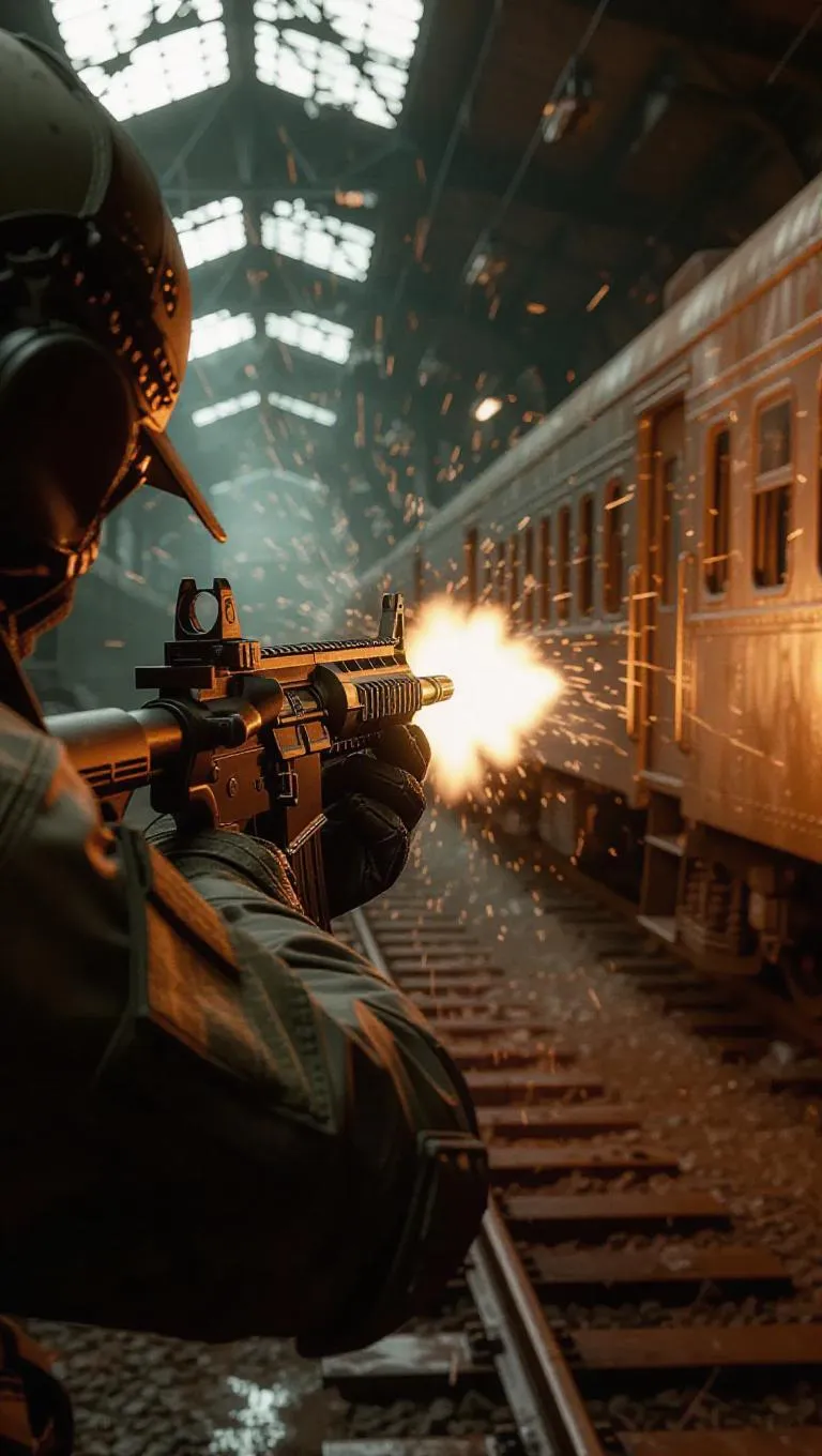 Text to ImageA tense gunfight erupts in derelict train yards, with shattered glass and broken tracks amplifying the chaos. The scene is framed in a cold, desaturated tone, emphasizing eerie, empty spaces and the echoes of gunfire.Recreate