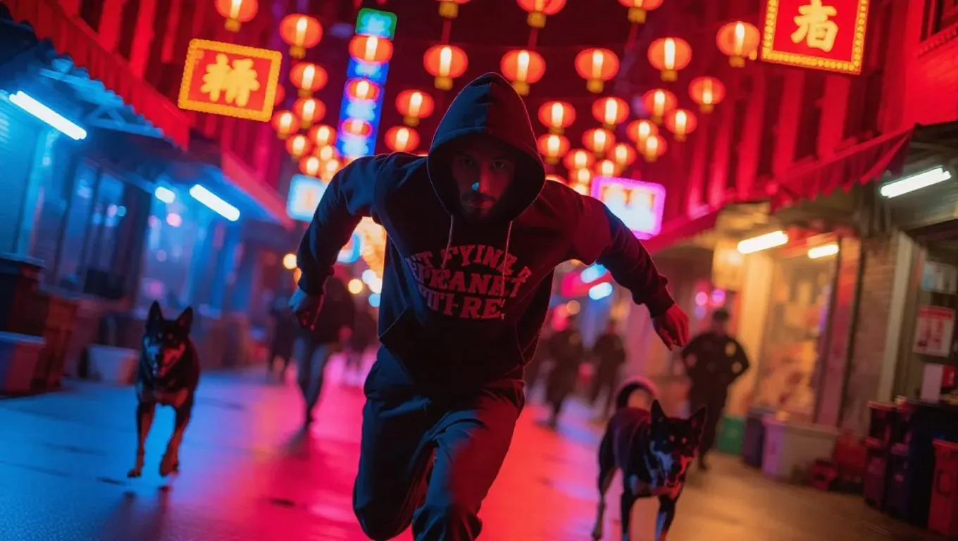 A fugitive in a ripped hoodie darts through an illuminated Chinatown market, neon signs glowing in chaotic colors behind him, as police chase dogs howl loudly. Lanterns dangle low overhead. High-angle observation with vivid depth and environmental storytelling.