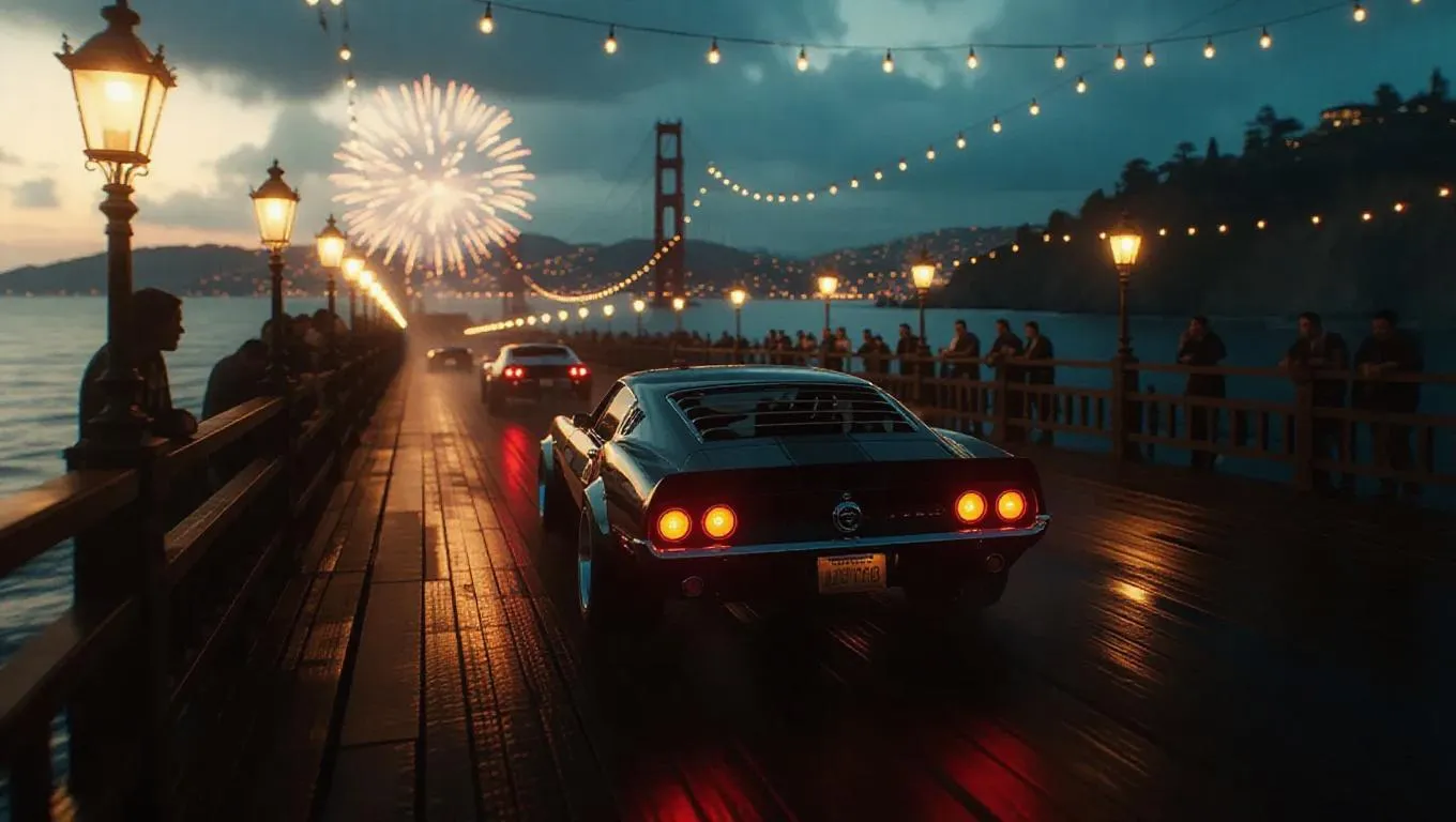 Text to ImageA spontaneous street race on a wooden bridge above the bay, engines roaring under cloudy skies as fireworks crackle. Spectators fill the railing, faces lit by old lanterns. High-speed cinematic motion and rich earthy-toned gradients.Recreate