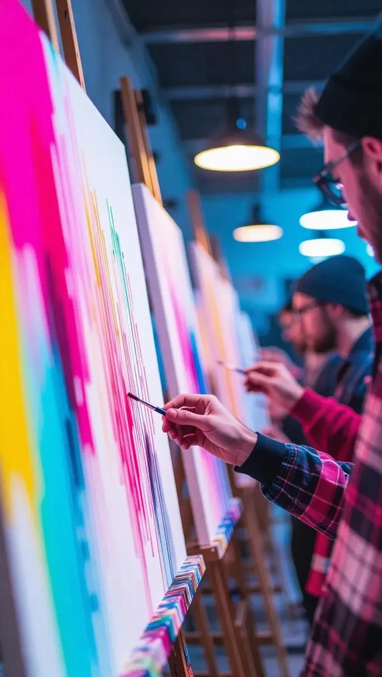 Text to ImageA group of hackers in an art studio surrounded by canvases and easels, uploading a virus as paint splashes reflect code across their faces. Creative cyber-thriller vibe with colorful lighting and artistic focus.Recreate