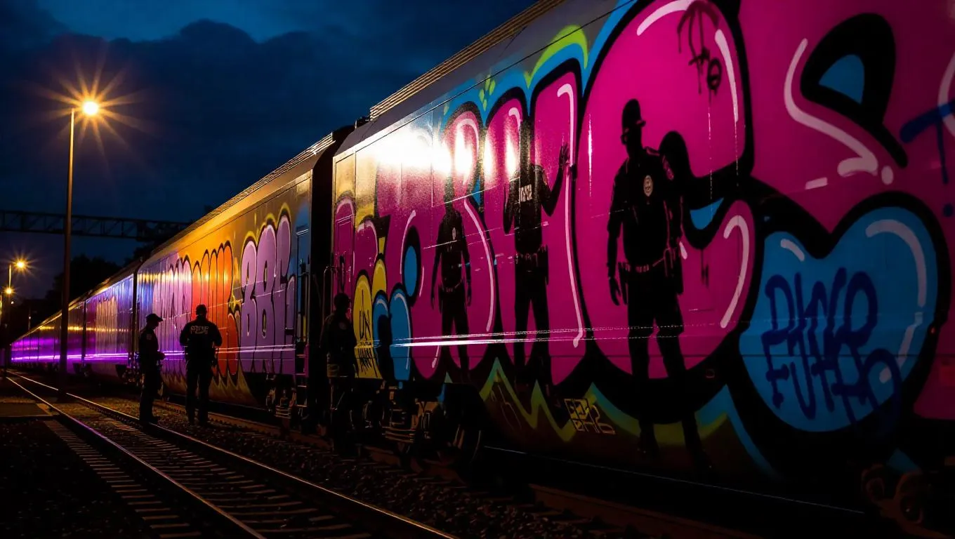 A team of taggers is at work on an enormous mural painted on the side of a train, their silhouettes brightened by a streetlamp's light. Nearby, police sirens wail, suggesting urgency. The scene carries an urban edge with a muted color range.