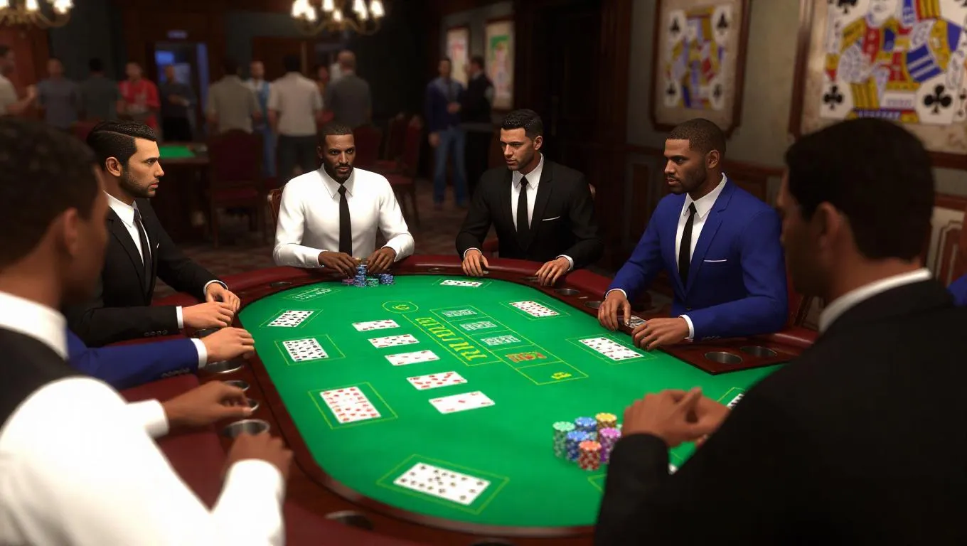 In a shadowy underground casino in Liberty City, a tense high-stakes poker game is abruptly interrupted by a loud commotion. Tables overturn, papers scatter, and players signal to each other, the room erupting into chaos as they prepare to negotiate their way out.