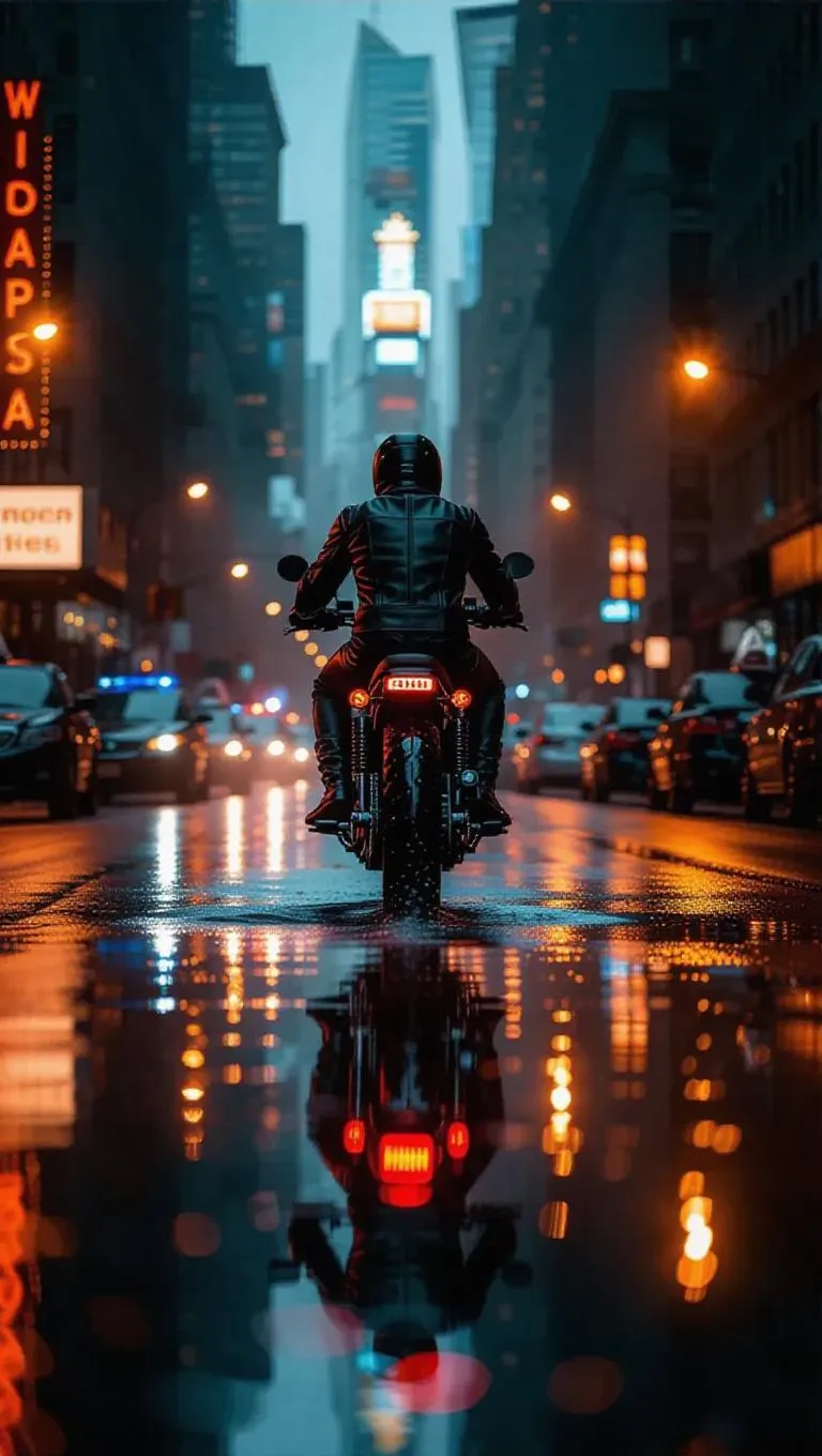 A solitary motorcyclist in a worn leather jacket speeds down a rain-slicked boulevard, backlit by exploding streetlights and illuminating city smoke. Digital reflections shimmer across puddles, and behind him, a chain of patrol cars twist through city shadows. Motion-capture angle from below, sparks trailing from the tailpipe, dramatic shallow depth of field.