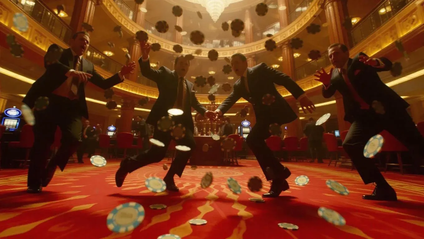 A dramatic casino heist in progress, agile thieves sneaking across a grand atrium, glittering chips and money caught midair in slow motion. Giant wooden sculptures and faux fur carpets contrast the chaos. Dynamic spiral camera angle, freeze-frame intensity with warm yellow lighting.